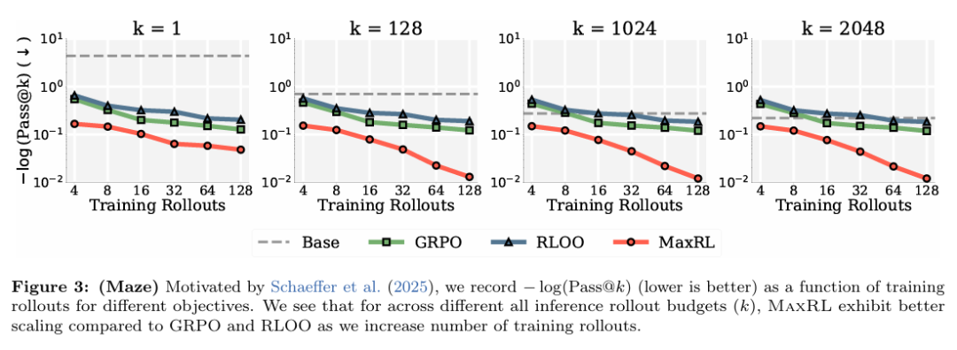 在迷宫任务上,无论测试时的采样预算 k 取何值,随着训练 rollouts 的增加,MaxRL 都能持续降低 −log (Pass@k),而 GRPO 与 RLOO 的改进幅度则明显更早趋于平缓。这一结果直观地展示了 MaxRL 在训练阶段更优的性能–效率权衡。