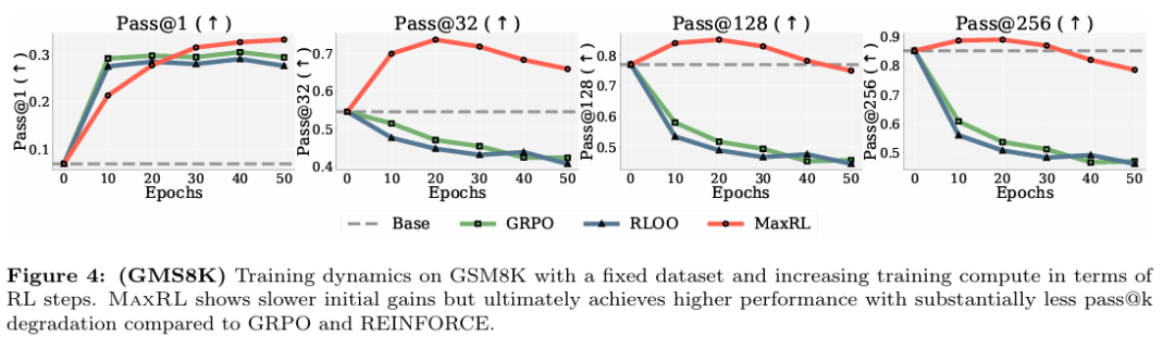 比较在不同 pass@k 设置下各方法随训练中采样计算增加时的优化趋势,可以看到,对于 GRPO 与 RLOO,曲线在早期下降后迅速变平,说明额外采样主要用于降低噪声;而 MaxRL 在不同 k 值下均保持持续下降,推动模型不断逼近一个更接近最大似然的优化目标。