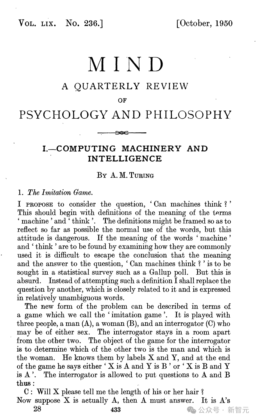 回想一下:1950年,图灵构思出了著名的「模仿游戏」,即如今广为人知的图灵测试,用于测试机器能否骗过人类,让人类以为它们是同类。