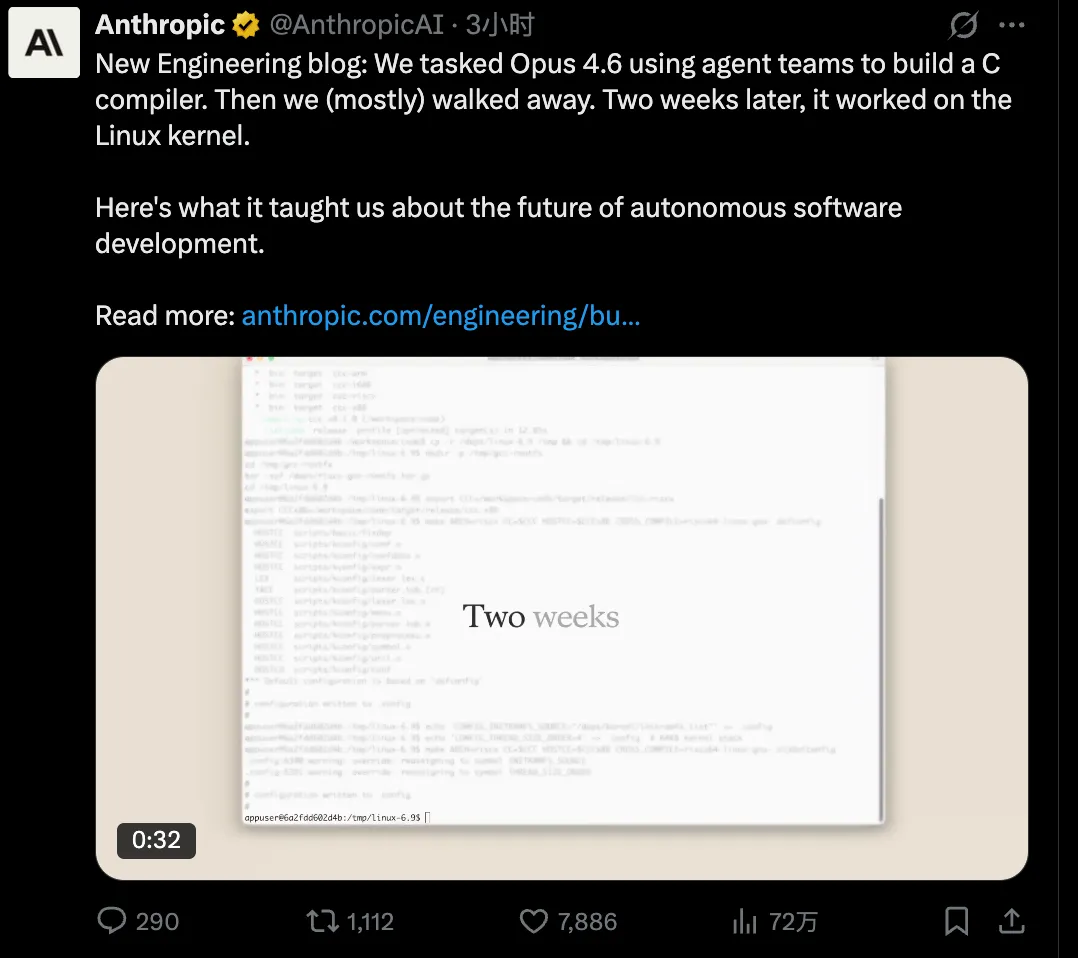 为了证明 Opus 4.6 的强大智能体能力,Anthropic 的一名研究员使用 16 个智能体从零开始构建了一个基于 Rust 的 C 语言编译器,设定任务后就基本放手不管了。最后 AI 输出的代码长达 10 万行,可以编译 Linux 内核,耗资 2 万美元,超过 2000 次 Claude Code 会话,历时两周。