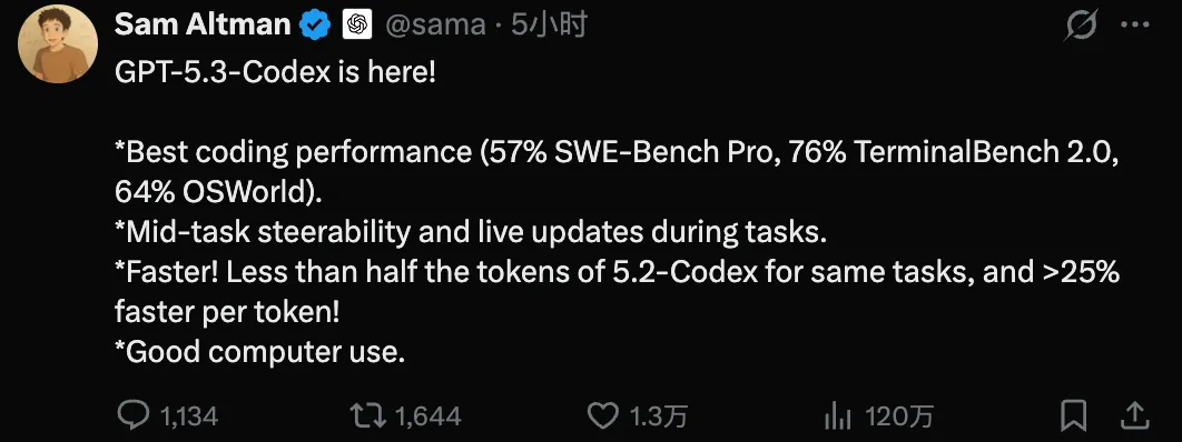 在 OpenAI 这边,新一代模型 GPT-5.3-Codex 的发布紧随其后。奥特曼称其拥有目前最佳的编码性能,进一步释放了 Codex 的潜能。