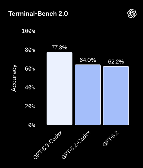 GPT-5.3-Codex 在多项基准上刷新纪录:在 SWE-Bench Pro 上达到 56.8%,在 Terminal-Bench 2.0 上达到 77.3%,同时相比此前版本运行更快、消耗的 token 更少。