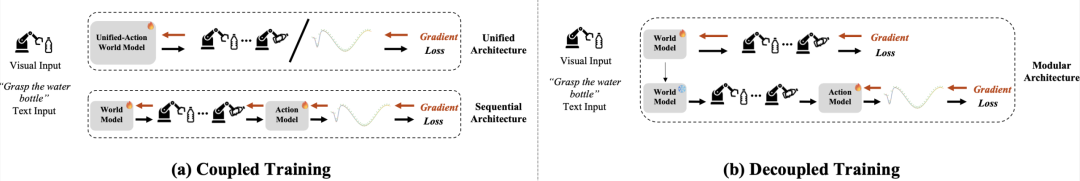 顺序组合(Sequential Architecture):世界模型和策略模型是分开的模块,但训练时会端到端联动:策略目标产生的误差信号会通过梯度反向传回世界模型,从而让生成结果更符合可执行性与物理一致性。