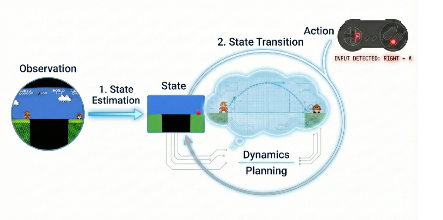观察(Observation):环境的原始感官数据。在视频模型中,这表现为高维的像素级输入,提供世界的局部、间接视图。