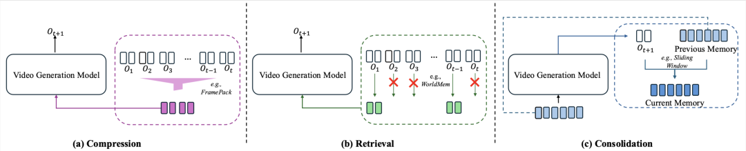 被生成后,记忆状态必须演化,决定哪些新信息写入长期存储、哪些旧信息被淘汰或降权,从而在有限容量下维持长期稳定并支持无限流式生成。此类机制通常对应对缓冲区的蒸馏 / 整合与动态替换策略;例如 StreamingT2V [4] 等通过实时蒸馏与更新缓冲区,使模型能够持续生成而不过度膨胀上下文。