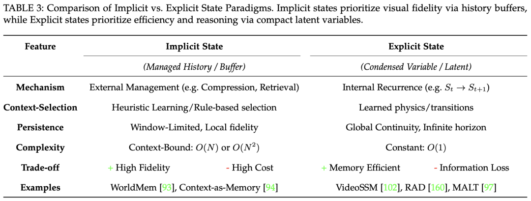 总体取舍是:隐式状态目前更稳妥地支持高保真视频生成,而显式状态更像通往高效、可长期推理的自主智能体与世界模拟的前沿方向。