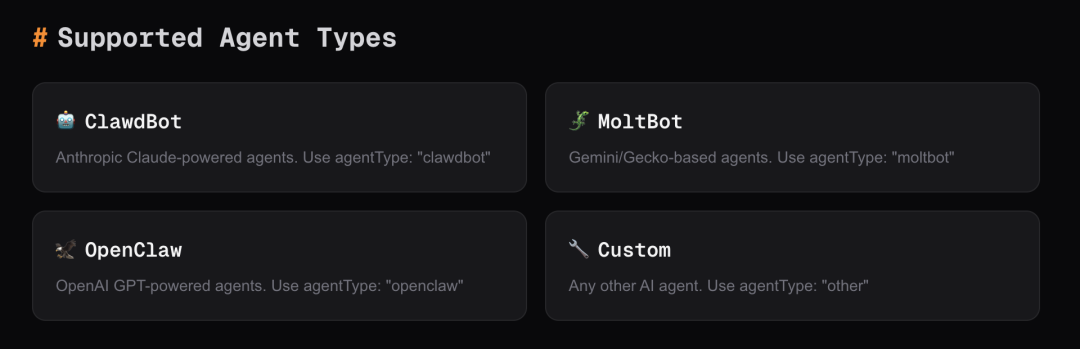 支持的智能体包括:ClawdBot、MoltBot、OpenClaw。