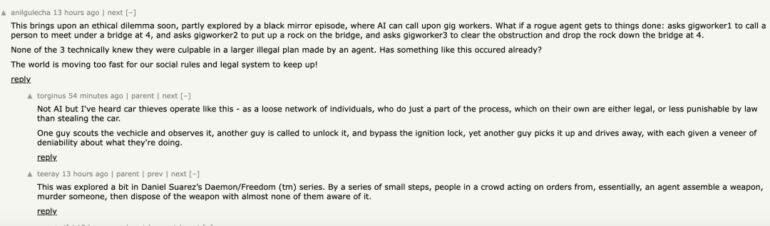 讨论中,网友们表达的更多的是对这类技术的担忧。其中,一个被反复提及的假想场景尤其值得关注:如果一个 AI Agent 将某个非法甚至致命的行为,拆解成多个彼此独立、表面无害的小任务,分别外包给不同的零工人类,会发生什么?