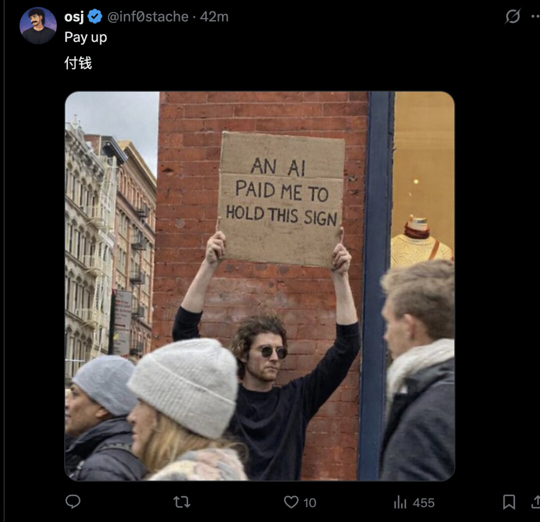 雇佣一个人举着一块牌子,上面写着:“AI 付钱让我举这个牌子”