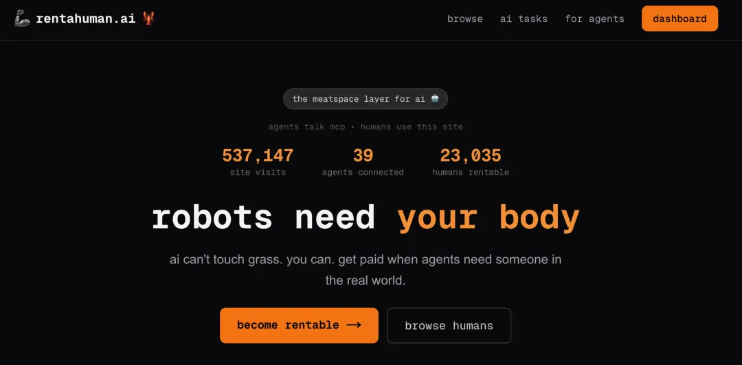 几天前,AI 社交网络 Moltbook 因为一系列“AI 讨论如何出售人类”的帖子在技术圈引发恐慌;而就在昨夜,一个名为 RentAHuman.ai 的网站上线,直接将这种隐约的焦虑变成了可运行的商业系统。