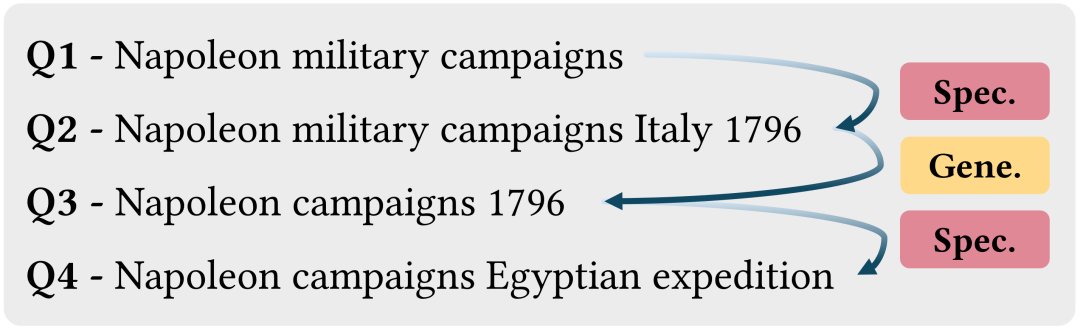 另一方面,智能体也表现出一定的 “重置 - 再细化”(Reset-then-Refine)模式,如下图可见,智能体先在一个宽泛主题上做专化(例如从 “拿破仑战役” 收窄到 “1796 年意大利战役”),随后通过去掉这些约束做一次泛化(得到更短、更宽泛的查询),再沿着另一个侧面重新专化(切换到 “埃及远征” 等新的细化方向)。