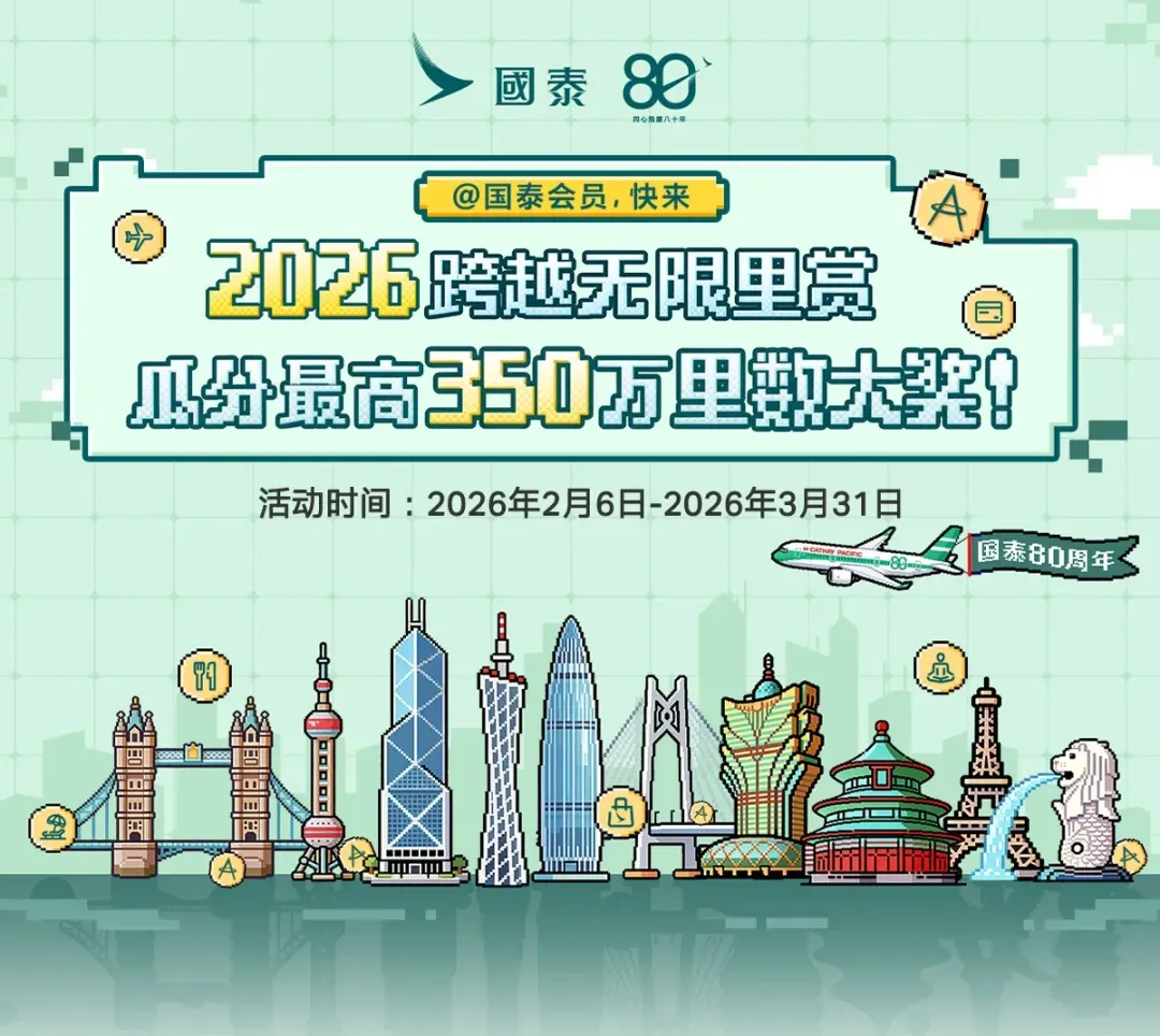 国泰航空80周年活动「跨越无限里赏」来袭!通过飞行、联名卡等渠道赚取里赏值,瓜分350万里程,最高可得3580里程!