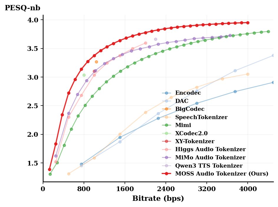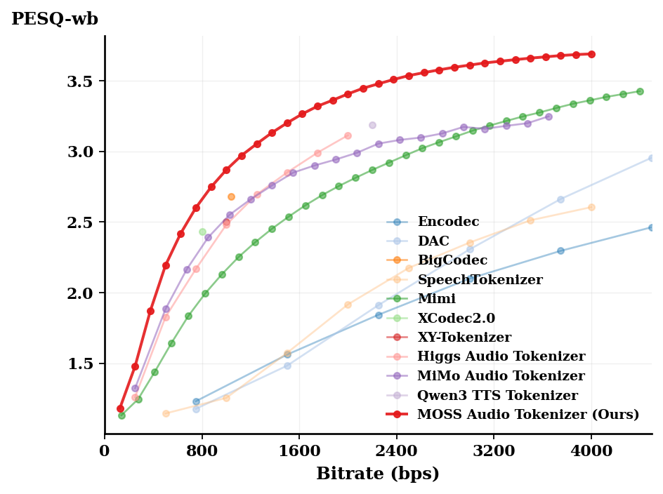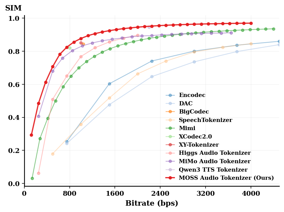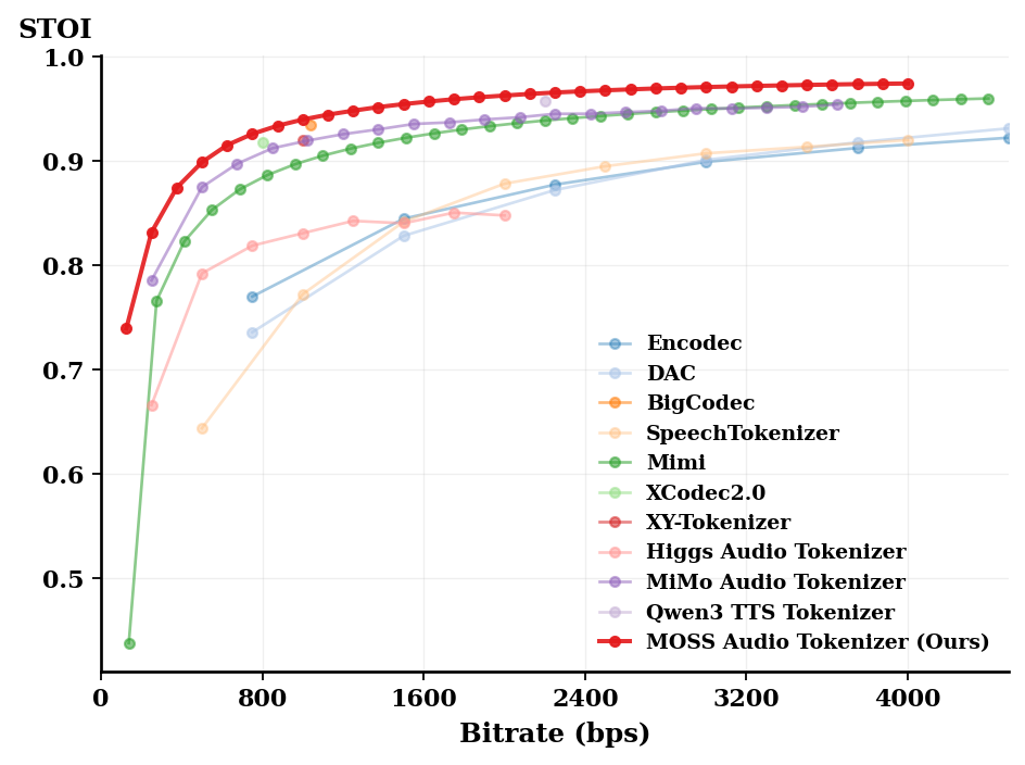 4. 语义 - 声学统一表征: MOSS Audio Tokenizer 编码得到的离散 Token 在保持 SOTA 级高保真还原音质的前提下,还蕴含了丰富的语义信息,能天然适配自回归生成模型的建模需求。
