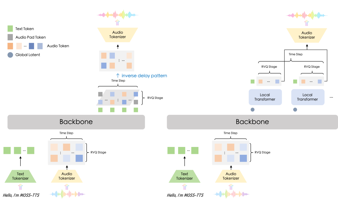 图例:左:Delay-Pattern(MossTTSDelay) 采用单一 Backbone +(n_vq+1)Heads,通过多码本 RVQ 的 delay scheduling 自回归生成音频 token;右:Global Latent + Local Transformer(MossTTSLocal) 由 Backbone 每步输出全局潜变量,再由轻量 Local Transformer 逐步发射 token block,更适合低时延流式合成。