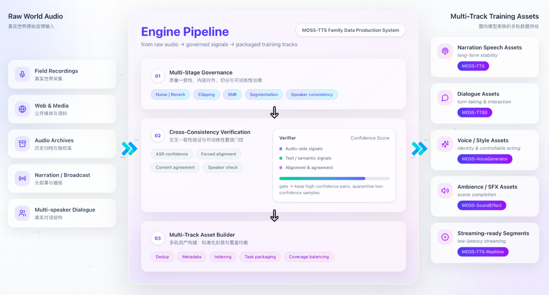 MOSS Data Engine 是支撑 MOSS-TTS Family 的数据生产系统:它不只是 “收集与清洗”,而是将真实世界的海量原始音频转化为可复用的训练资产 —— 既能承载长时叙事的稳定性,也能覆盖对话交互、角色塑造与音效补全等多种生成形态。
