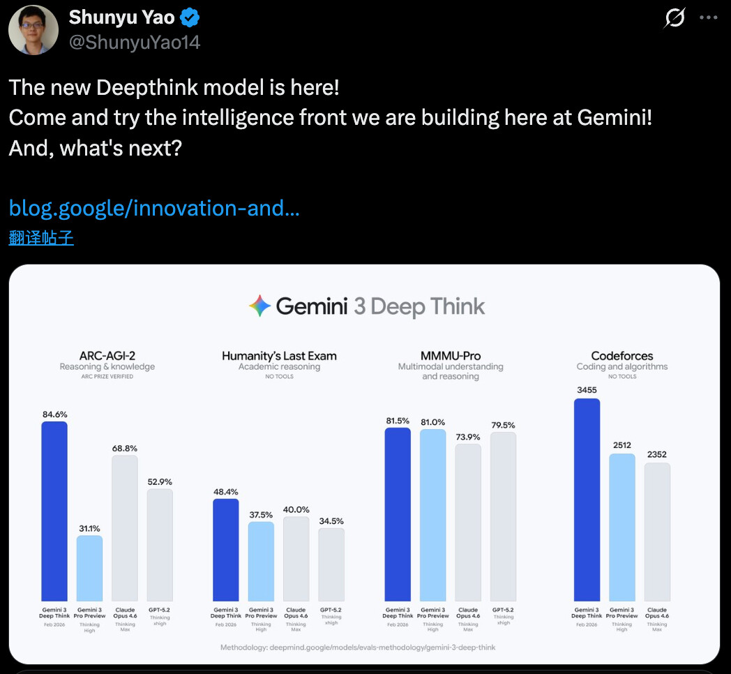 去年 9 月加入 Google DeepMind 的清华物理系传奇姚顺宇(Shunyu Yao)也是这次 Deep Think 新模型的参与者。