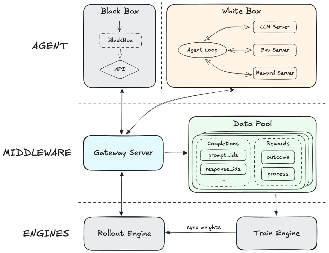 Forge 在设计上通过引入中间层完全解耦了底层训推引擎与 Agent,把「模型只负责处理 Token」这件事做到了极致。模型训练和推理看到的都是同一种 Token 形态,不去理解什么工具调用、环境状态这些复杂结构。而 Agent 那一侧则通过标准的 OpenAI 接口和模型通信,专心处理环境交互和上下文管理。