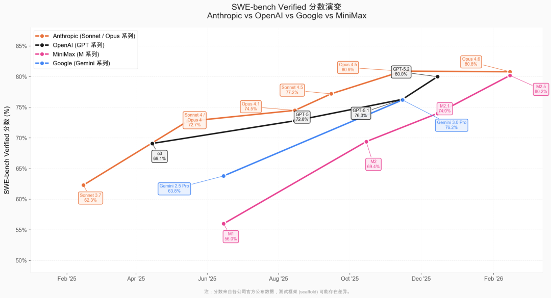 这让 M2 系列模型在编程领域最具代表性的 SWE-Bench Verified 榜单上,相比 Claude、GPT 和 Gemini 等顶级模型系列,保持了行业最快的进步速度 —— 这从上图折线的斜率也能看出。