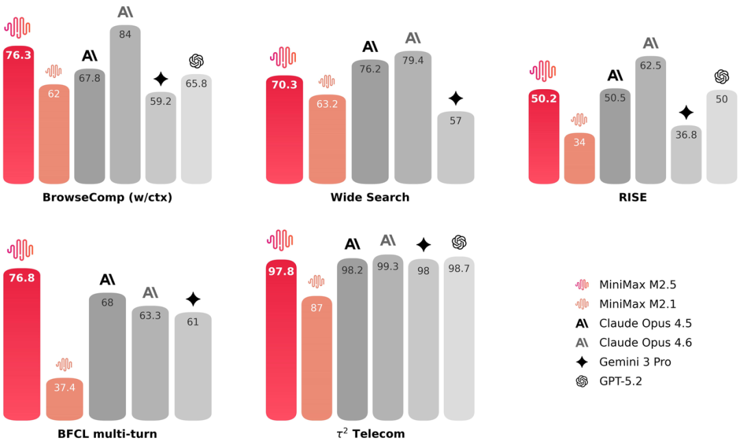 在 BrowseComp、Wide Search 等搜索和工具调用榜单的评测中,M2.5 也达到了行业顶尖的水平。