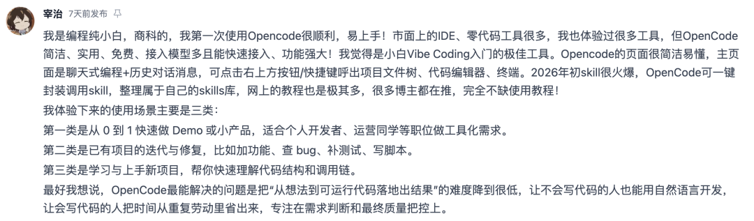 OpenCode:为 Vibe Coding 场景设计的 AI 编程工具。把聊天、代码编辑、文件树和终端放在同一界面,支持 skill 封装与多模型切换,对编程新手非常友好。