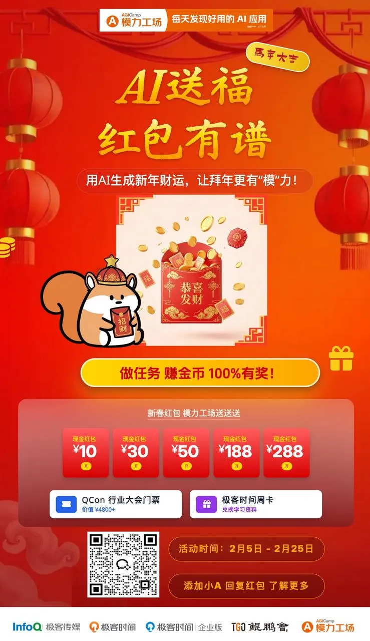 模力工场 邀你用 AI 一键生成新年财运红包封面!2 月 5 日至 25 日,设计松鼠 × 模力创意红包,即可赢金币参与多轮现金抽奖。扫码进群,马上开启你的开年好运!