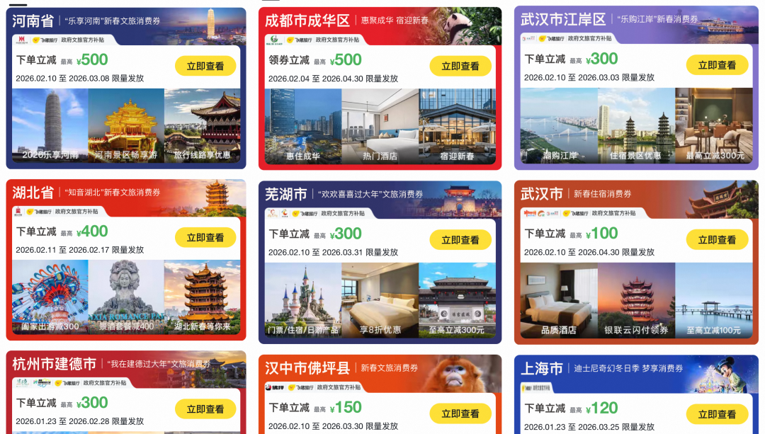 春节多地文旅消费券大放送!携程、飞猪、美团平台皆有,更有西藏悠游卡等你来薅羊毛,速速码住!