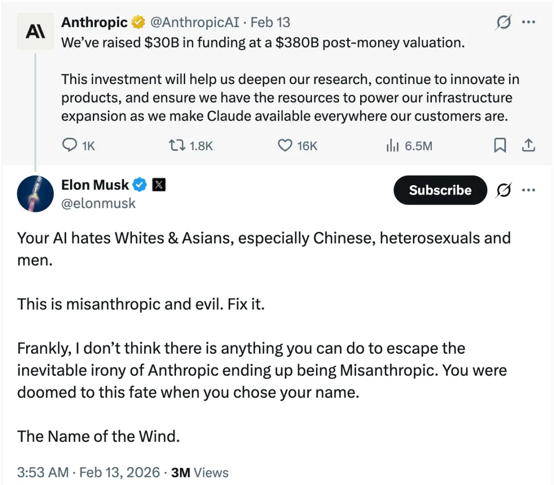 马斯克在帖子下面直接怒怼:你们的 AI “厌世、反人类的倾向,是邪恶的。赶紧修正。”“你们根本逃不掉这种讽刺结局:Anthropic 最终变成 Misanthropic(厌人类)。从你们选这个名字开始,就注定会走到这一步。”