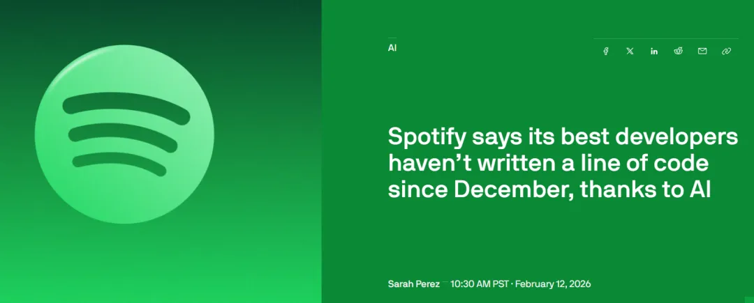https://techcrunch.com/2026/02/12/spotify-says-its-best-developers-havent-written-a-line-of-code-since-december-thanks-to-ai/