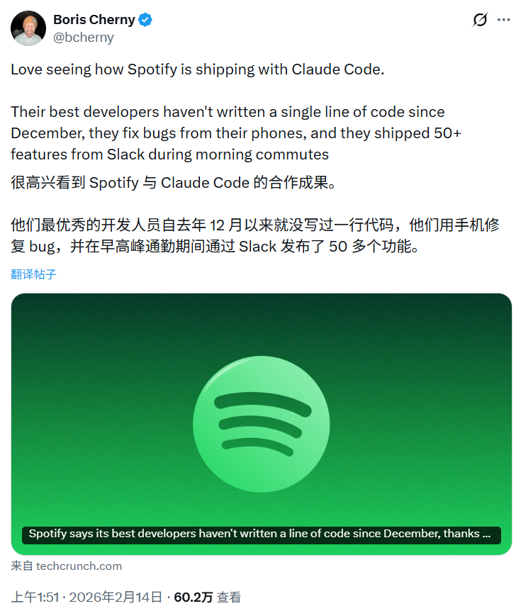 Claude Code 负责人 Boris Cherny 发帖引用了这篇报道,祝贺 Spotify 与 Claude Code 的成功合作。