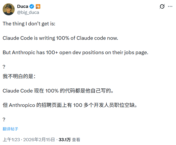 还有不少对于 Anthropic 本身的质疑,一位网友发出了直击灵魂的拷问:既然宣称 Claude Code 已经包揽了 100% 的写代码工作,那为什么 Anthropic 自己的官网招聘页上,还挂着上百个急招的开发岗位?