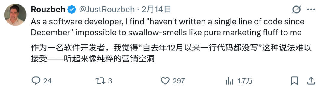 不少一线开发者对「几个月不写一行代码」的说法嗤之以鼻,认为这违背了基本的开发常识,闻起来全是一股包装过度的公关营销味儿。