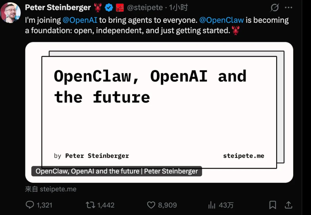 就在刚刚,OpenClaw之父Peter Steinberger宣布,他加入了OpenAI,而OpenClaw 将成为一个开放、独立的基金会。