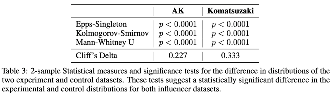 最后,该研究通过三个测试建立统计显著性,将实验数据的分布与控制集 Epps-Singleton (ES)、Kolmogorov-Smirnov (KS) 和 Mann-Whitney U (MWU) 的分布进行比较。如表 3 所示,所有结果的 p 值都远低于 α = 0.001。由此,该研究可以有力推翻原假设:博主分享的论文和对照组的引用分布相同。