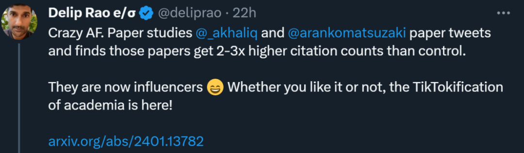 具体来说,他们编制了一个包含 8000 多篇论文的综合数据集。这些论文涵盖了两位博主从 2018 年 12 月到 2023 年 10 月期间的推文,并伴有基于发表年份、发表地点和摘要主题的 1:1 匹配对照组。分析结果显示,得到二人推荐的论文,其引用次数显著增加,中位数引用次数是对照组的 2 到 3 倍。这样的结果引发了社区的一些担忧,有人认为这代表学术界正在 TikTok 化。