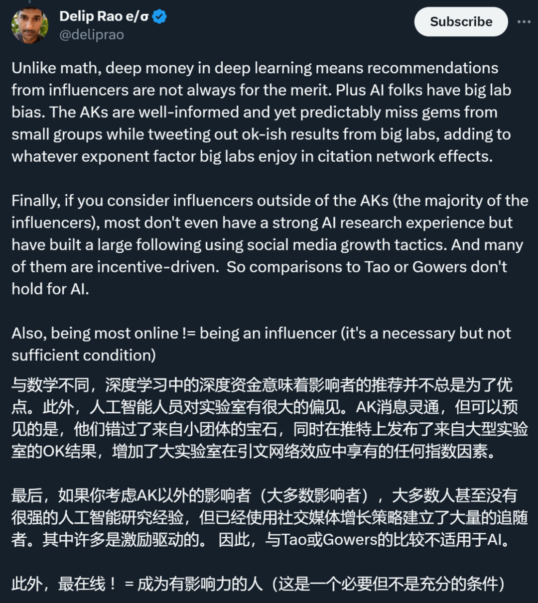 但有人反驳说,AI 和数学领域的情况完全不同。一方面,AI 领域涉及大量资金投入和经济利益,这可能影响到博主推荐内容的客观性和公正性。另一方面,博主在挑选论文时可能更容易关注到大实验室的论文,这对一些小实验室来说可能不太公平。