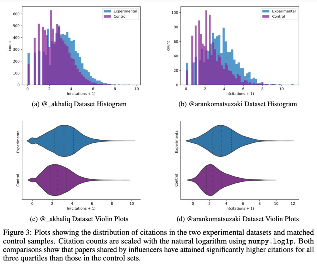 该研究将推特博主 AK 和 Komatsuzaki 分享的论文与控制集的影响进行了比较,然后根据所选论文的地理分布和作者属性进行多变量分析。