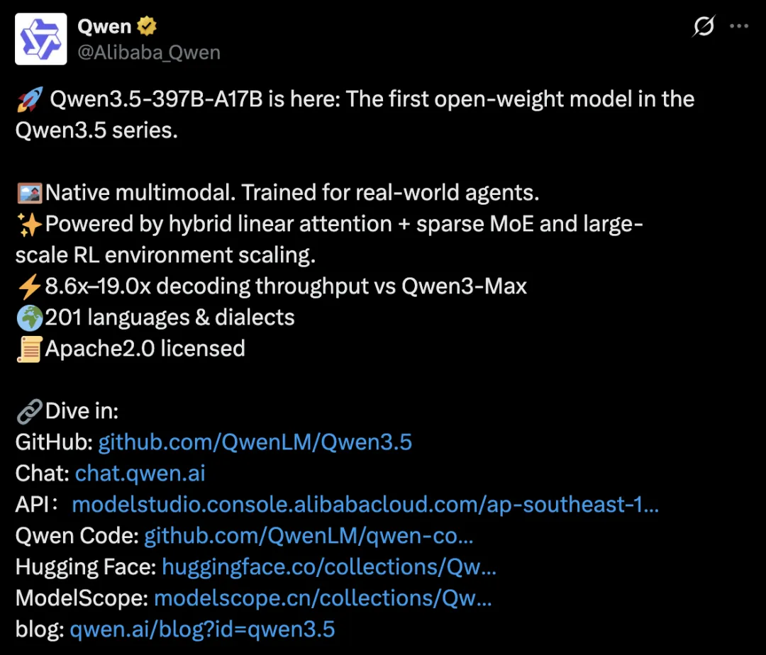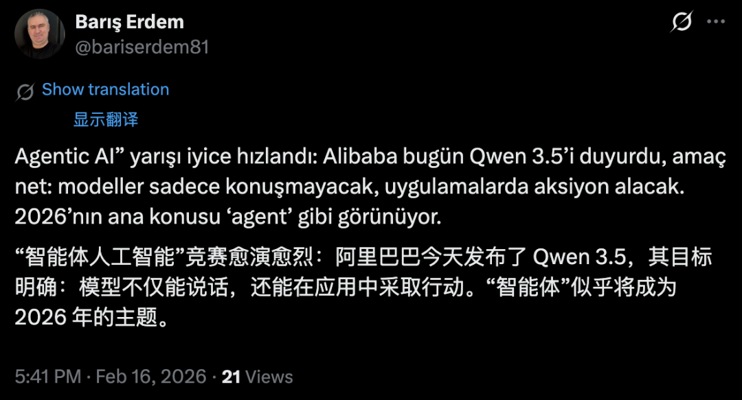 该用户指出,阿里巴巴 发布 Qwen 3.5 的目标并不止于提升对话能力,而是让模型能够在真实应用中采取行动,包括在应用程序中执行任务、完成操作流程等。在其看来,“模型不仅会说话,还会做事”正在成为新的竞争方向,而“智能体”很可能成为 2026 年最重要的 AI 主题之一。