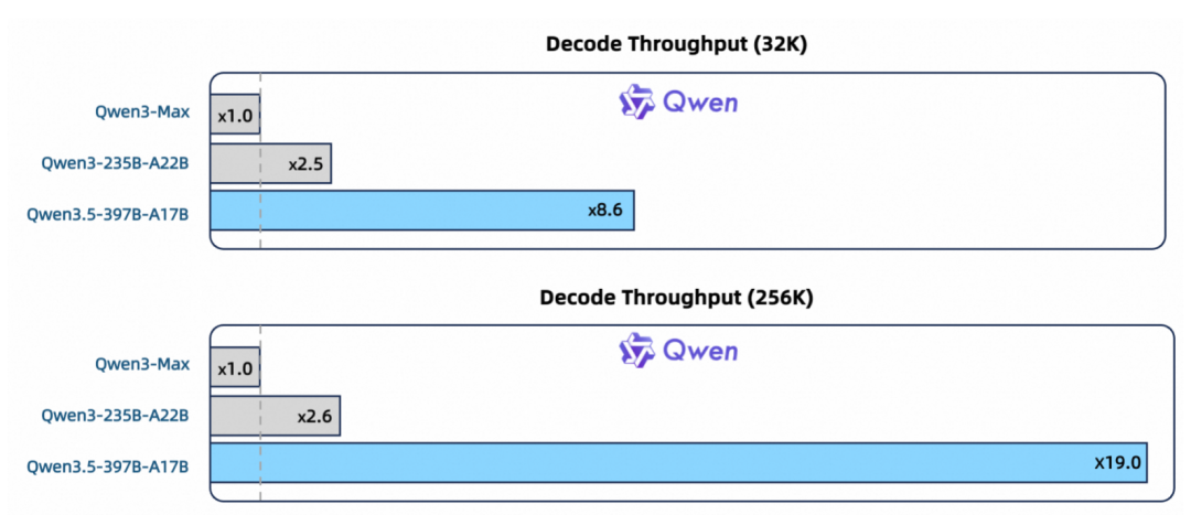 效率(Efficiency):基于 Qwen3-Next 架构——更高稀疏度的 MoE、Gated DeltaNet + Gated Attention 混合注意力、稳定性优化与多 token 预测。在 32k/256k 上下文长度下,Qwen3.5-397B-A17B 的解码吞吐量分别是 Qwen3-Max 的 8.6 倍 /19.0 倍,且性能相当。Qwen3.5-397B-A17B 的解码吞吐量分别是 Qwen3-235B-A22B 的 3.5 倍 /7.2 倍。