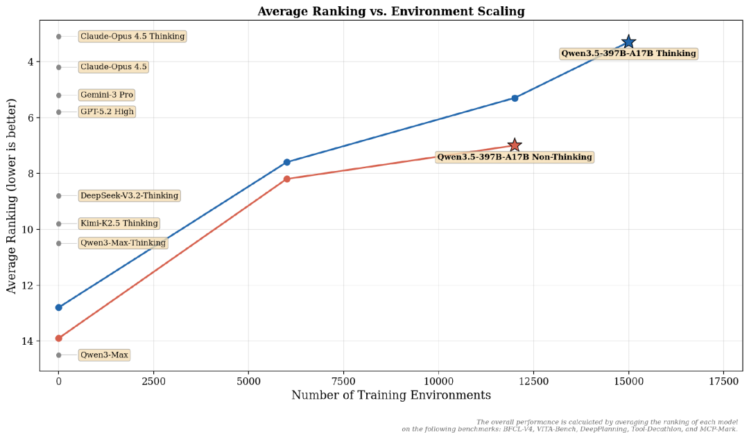 下图展示了在通用 Agent 能力上,模型效果随 RL Environment scaling 带来的增益。整体性能由各模型在以下基准上的平均排名计算得出:BFCL-V4、VITA-Bench、DeepPlanning、Tool-Decathlon 和 MCP-Mark。