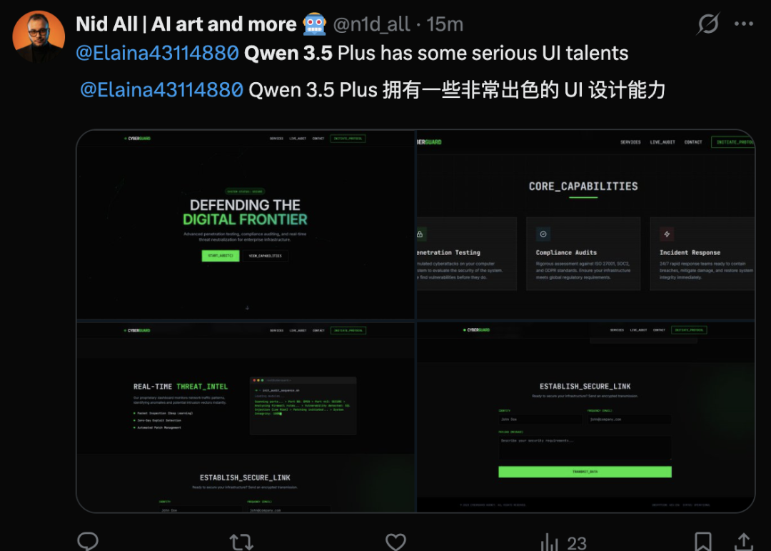 在 x 平台,有用户首先注意到模型在界面与交互层面的能力。一位网友评价称,Qwen 3.5 Plus 展现出“非常出色的 UI 设计能力”,在生成界面布局、组件结构以及交互逻辑时,整体完成度明显高于以往的大模型表现。这类能力被认为对低代码开发、应用原型设计等场景具有直接价值。