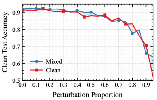 在混合训练设置下,模型的泛化性能主要由干净数据主导,只要干净样本数量足够,模型仍能学习到稳定且可泛化的特征表示。