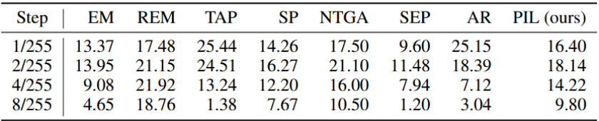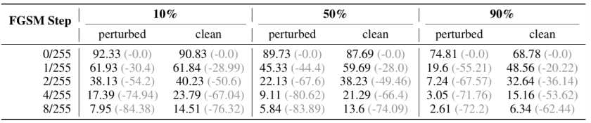 表 1:不同 FGSM 攻击步长下不可学习样本导致的额外准确率下降百分比(扰动比例 50%)