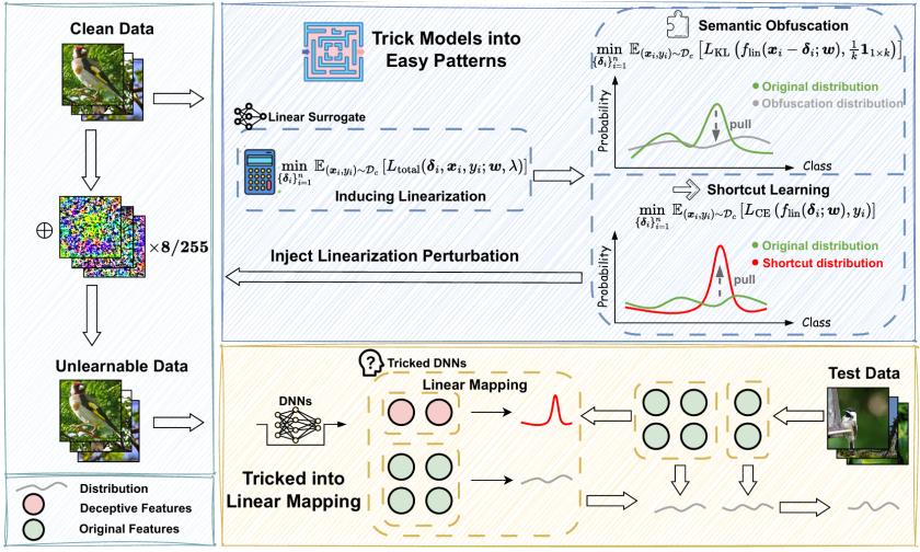 两个目标通过平衡参数 λ 进行联合优化,最终生成的扰动同时抑制语义学习并强化线性捷径,从而在深模型训练阶段诱导其产生显著的泛化退化。