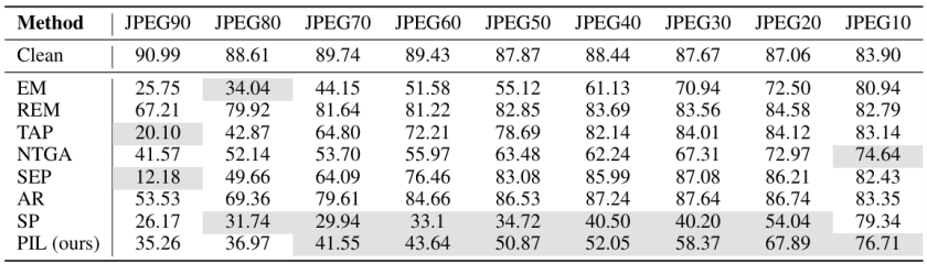 在多种数据增强策略(旋转、裁剪、MixUp)和不同 JPEG 压缩质量下,PIL 依然保持稳定的防护性能。
