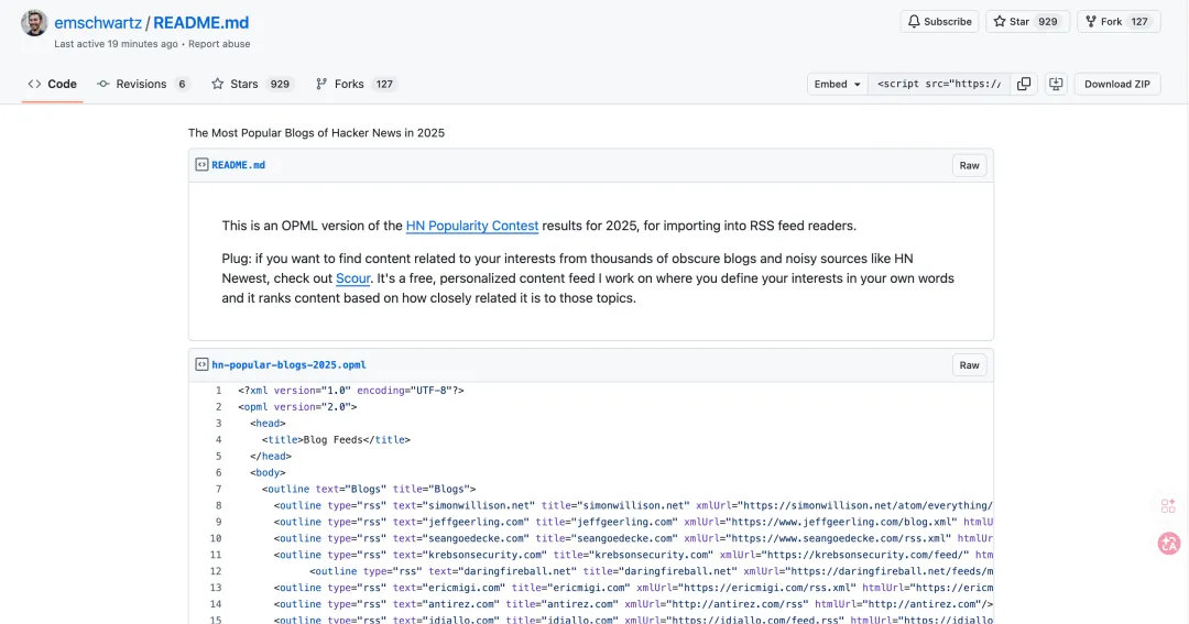 一个包含了 92 个顶级科技博客的 RSS 清单。