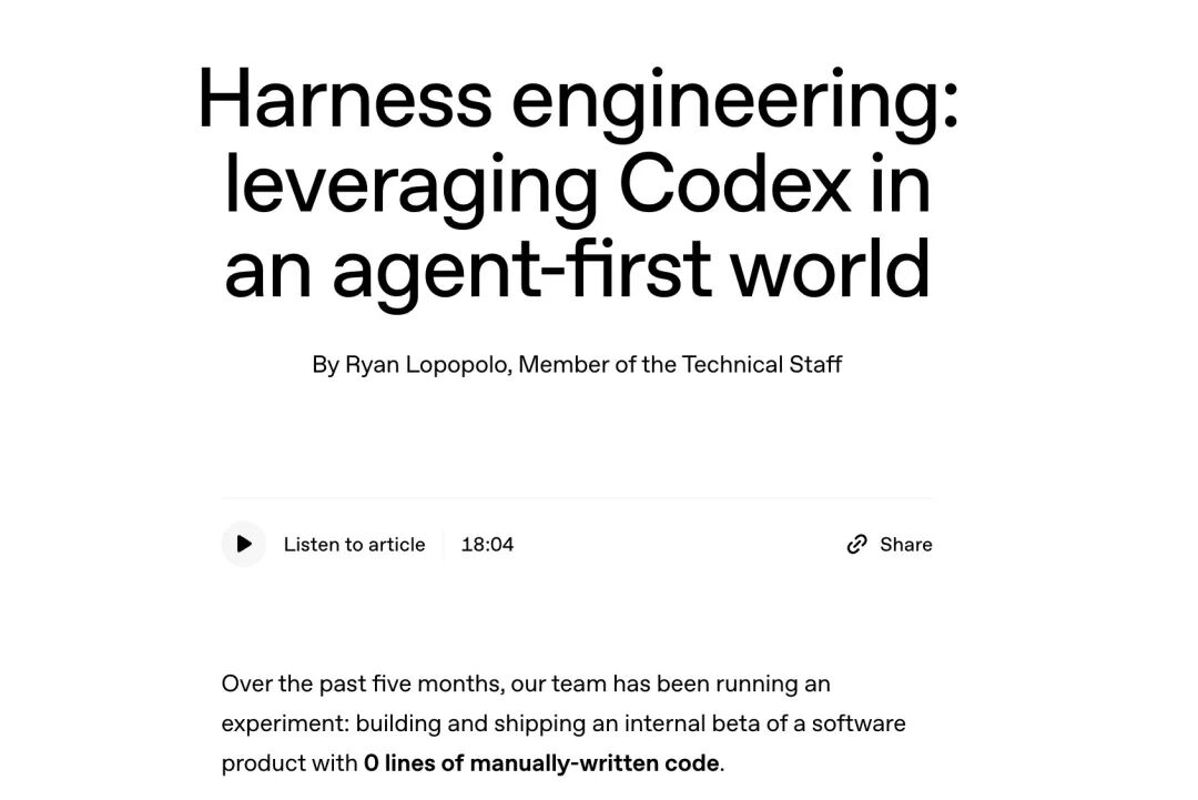 小编注:Sherwin Wu 提到的这次实验,OpenAI 已经写成博客公开了:https://openai.com/index/harness-engineering/。文章记录了一个“0 人手写代码”的软件工程实验:团队用 5 个月从空 Git 仓库起步,做出一个真实可用的内部产品——能上线部署、会出故障也会被修复,且已经被数百名内部用户使用(包括每天都在用的重度用户)。但从头到尾 没有任何人工直接写代码:应用逻辑、测试、CI 配置、文档、可观测性、内部工具,全部由 Codex(Codex CLI + GPT-5)生成。最终在仅 3 名工程师驱动下,累计合并约 1500 个 PR、产出接近 100 万行代码;他们估算整体交付速度约为传统手写的 1/10。