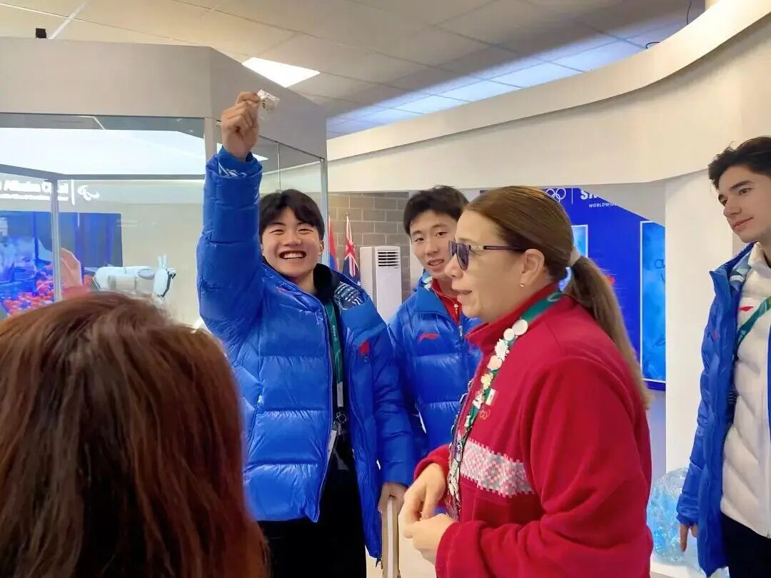 中国运动员李文龙通过装置开出了本届冬奥吉祥物 Tina 的徽章,兴奋之情溢于言表。在此之前,他还在徽章交换站门口偶遇传说中的墨西哥领队,把那枚「一 Pin 难求」的墨西哥队顶流徽章收入囊中。