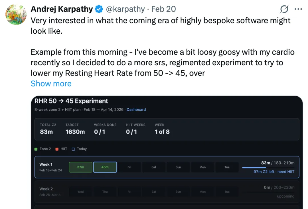 3、文章中提到,Karpathy 花了一小时就用 AI 定制了一个有氧运动追踪器。你认为目前 AI 在软件开发方面的能力已经发展到什么程度了?距离实现完全的“AI 自动编程”还有多远?