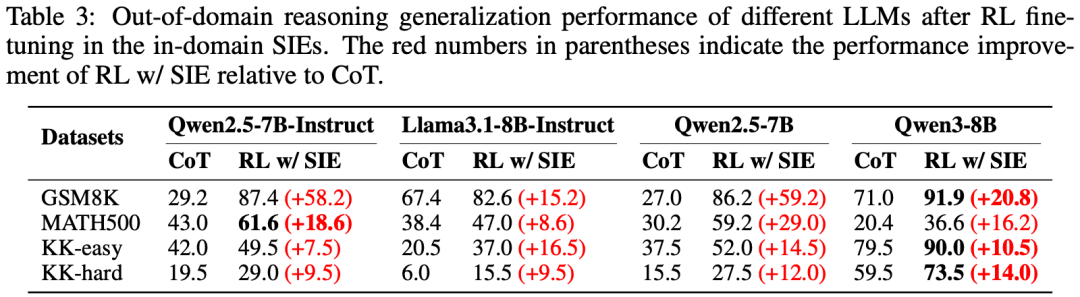 这部分是该研究最核心的发现之一。在基于知识图谱构建的结构化环境中训练出的模型,其推理能力能成功迁移到数学和逻辑等领域外任务。在 GSM8K/MATH500(数学推理)以及 Knights & Knaves(逻辑谜题)测试中,经过 SIE 训练的模型均表现出优异的泛化性能。例如,经过结构化 RL 训练,Qwen2.5-7B-Instruct 在 GSM8K 上的准确率从 29.2% 提升至 87.4%。这有力地证明了 SIE 框架培养的是一种通用的、底层的组合推理技能,而非特定领域的过拟合能力,打破了以往认为结构化推理无法迁移到通用推理的印象。