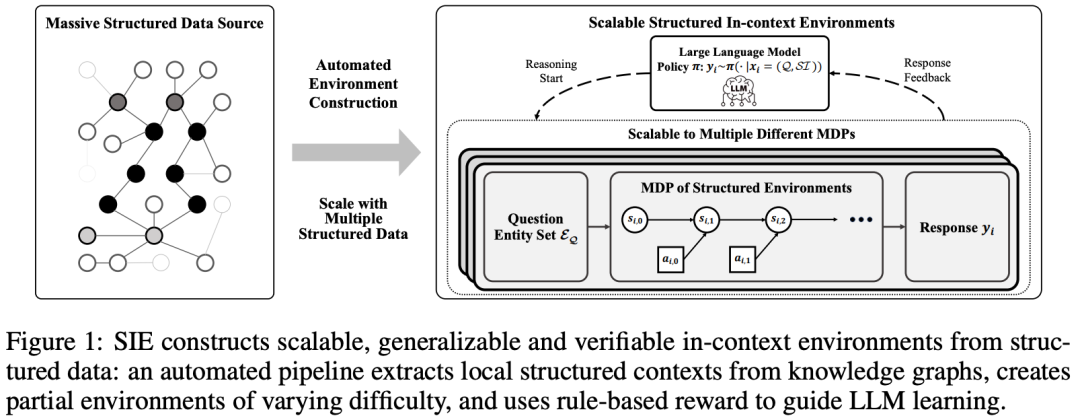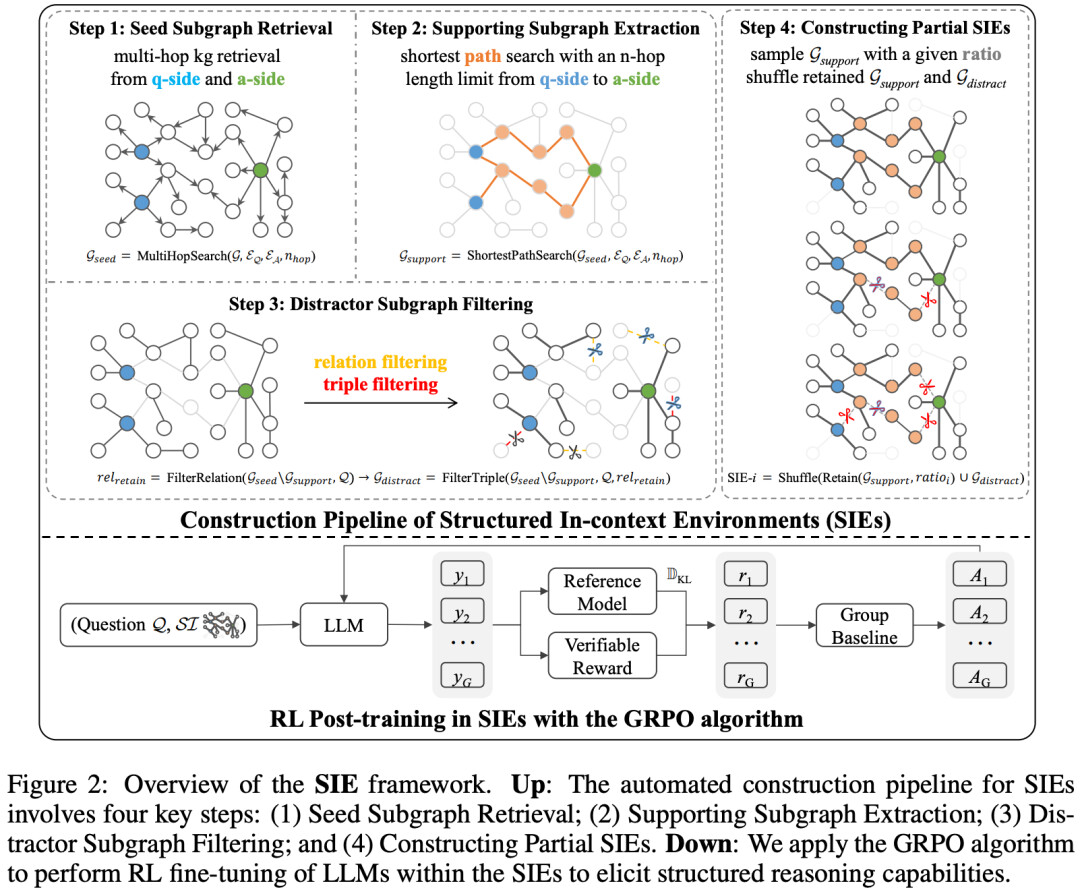 SIE 框架的核心在于如何将静态的数据转化为动态的、具有挑战性的推理环境。研究团队设计了一套精密的自动化流水线,将环境动态编码为结构化上下文,并作为软约束置入提示词中。模型的思维过程被建模为在这一上下文中的隐式动作序列,其最终输出直接用于计算环境奖励信号。为了验证这一框架,团队基于 Freebase 知识图谱构建了 RL 训练环境,其过程包含四个关键步骤。